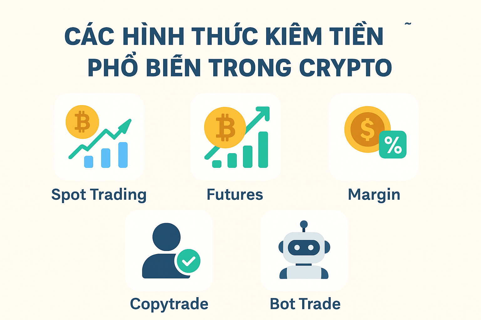 Thị trường tiền điện tử (crypto) đã và đang trở thành mảnh đất màu mỡ cho những ai muốn tự do tài chính. Nhưng để “kiếm tiền trong crypto” không chỉ là việc mua Bitcoin và chờ giá tăng. Có hàng loạt cách khác nhau để tạo ra thu nhập — từ giao dịch truyền thống đến tự động hóa bằng bot. Trong bài viết này, chúng ta sẽ cùng tìm hiểu 5 hình thức kiếm tiền phổ biến nhất trong crypto mà cả người mới lẫn trader lâu năm đều có thể tham gia.