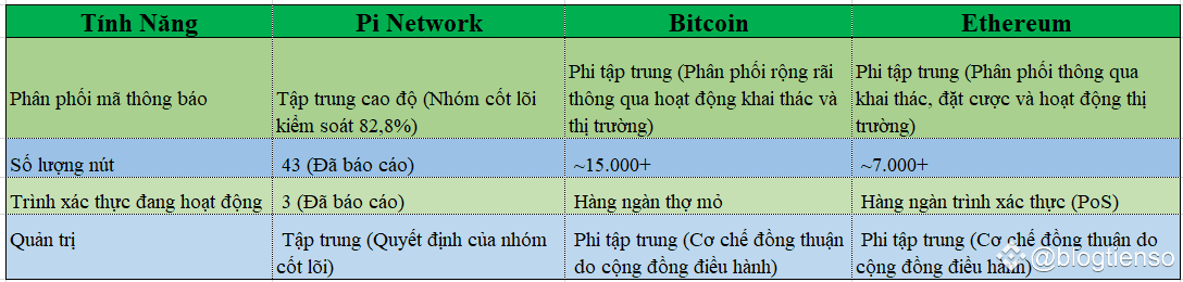 Để hiểu được mức độ nghiêm trọng của mối lo ngại về tập trung hóa , chúng ta hãy so sánh Pi Network với các blockchain phi tập trung thực sự đã được thiết lập như Bitcoin và Ethereum: